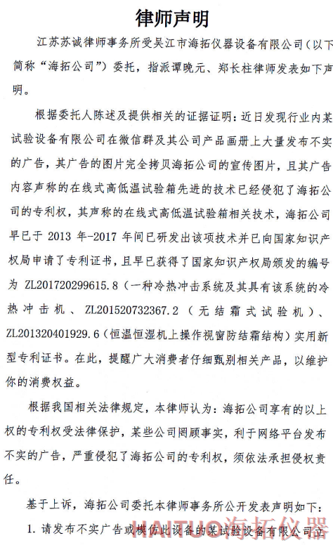 海拓儀器律師聲明:反對(duì)侵權(quán)行為 維護(hù)公司和消費(fèi)者權(quán)益摘要:國內(nèi)試驗(yàn)設(shè)備領(lǐng)先者吳江市海拓儀器設(shè)備有限公司委托律師事務(wù)所發(fā)布了律師聲明,該聲明指出,當(dāng)前市面上出現(xiàn)了產(chǎn)品專利侵犯海拓儀器權(quán)益,海拓儀器將以法律手段維護(hù)自身利益。該律師聲明要求某試驗(yàn)設(shè)備有限公司立即停止侵權(quán)行為,扯下其在網(wǎng)絡(luò)平臺(tái)的相關(guān)廣告和宣傳畫冊(cè)并同時(shí)停止生產(chǎn)同款設(shè)備。如果該設(shè)備公司不聽勸解,海拓儀器將向人民法院依法起訴該公司侵權(quán)行為,以維護(hù)自身合法權(quán)益和維護(hù)客戶消費(fèi)權(quán)益,并建議廣大消費(fèi)者仔細(xì)甄別相關(guān)產(chǎn)品。? ? ? ?近日,吳江市海拓儀器設(shè)備有限公司委托律師事務(wù)所發(fā)布了律師聲明,該聲明指出,當(dāng)前市面上出現(xiàn)了產(chǎn)品專利侵犯海拓儀器權(quán)益,海拓儀器將以法律手段維護(hù)自身利益。??事件源起于海拓儀器發(fā)現(xiàn)市面上有同類設(shè)備公司通過完全拷貝海拓儀器產(chǎn)品宣傳圖片,在微信群及該公司產(chǎn)品畫冊(cè)上大量發(fā)布不實(shí)廣告。??聲明指出,該廣告聲稱的在線式高低溫試驗(yàn)箱的技術(shù)侵犯了海拓儀器的專利權(quán),該產(chǎn)品專利由海拓儀器 -