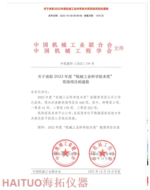 海拓儀器榮獲2022年度中國機(jī)械工業(yè)科學(xué)技術(shù)獎(jiǎng)?ICC訊?10月20日,2022年度“中國機(jī)械工業(yè)科學(xué)技術(shù)獎(jiǎng)”項(xiàng)目名錄正式發(fā)布,由海拓儀器(江蘇)有限公司完成的“超快速冷熱沖擊試驗(yàn)系統(tǒng)關(guān)鍵技術(shù)研究與系列應(yīng)用”項(xiàng)目榮獲2022年度“中國機(jī)械工業(yè)科學(xué)技術(shù)獎(jiǎng)”三等獎(jiǎng)。??據(jù)了解,中國機(jī)械工業(yè)科學(xué)技術(shù)獎(jiǎng)是根據(jù)《國家科學(xué)技術(shù)獎(jiǎng)勵(lì)條例》和《社會(huì)力量設(shè)立科學(xué)技術(shù)獎(jiǎng)管理辦法》的有關(guān)規(guī)定,由中國機(jī)械工業(yè)聯(lián)合會(huì)和中國機(jī)械工程學(xué)會(huì)共同設(shè)立并經(jīng)國家科學(xué)技術(shù)部批準(zhǔn),在國家科技獎(jiǎng)勵(lì)主管部門登記的面向全國機(jī)械行業(yè)的綜合性科技獎(jiǎng)項(xiàng)。旨在表彰在機(jī)械工業(yè)科技工作中作出突出貢獻(xiàn)的單位和人員,獎(jiǎng)勵(lì)范圍包括:機(jī)械工業(yè)科學(xué)技術(shù)發(fā)明成果、機(jī)械工業(yè)科學(xué)技術(shù)進(jìn)步成果、機(jī)械工業(yè)工程化和新技術(shù)推廣成果和機(jī)械工業(yè)軟科學(xué)和標(biāo)準(zhǔn)成果。??海拓儀器是一家集研發(fā)、制造、貿(mào)易于一體高科技現(xiàn)代化公司,公司成立于2005年,主要產(chǎn)品包括:超快速冷熱沖擊試驗(yàn)機(jī)(熱流儀)、快速溫變應(yīng)力篩選試驗(yàn)箱(ESS), -